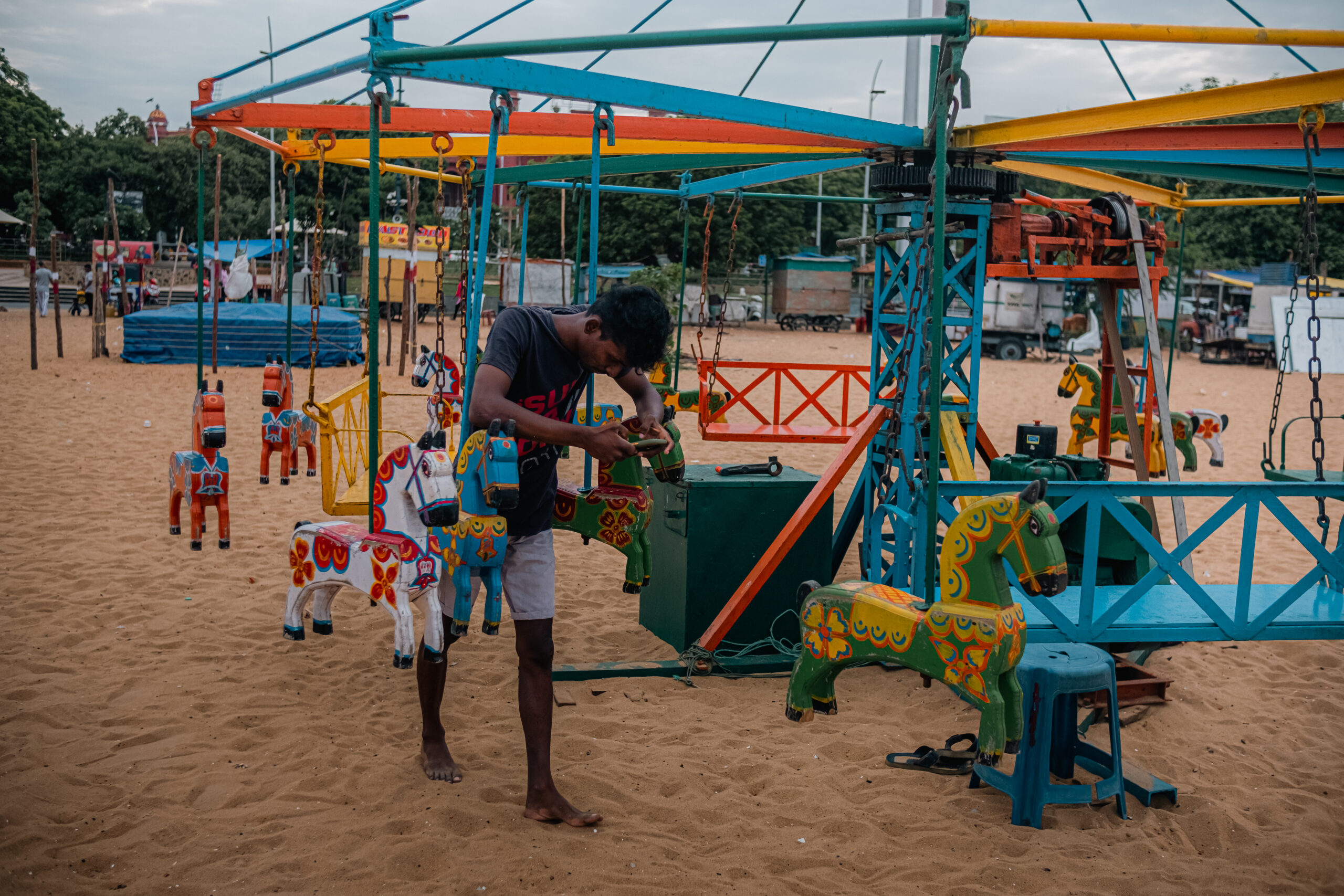 This album is a visual journey through Chennai’s shoreline, where everyday life unfolds in fleeting, unguarded moments. Shot in both monochrome and color, the collection captures the city’s contrasts—its timeless stillness and its vibrant pulse. Horses saddled on the sand, children wading into the surf, and carnival rides waiting for laughter all speak to the layered rhythms of Marina Beach.